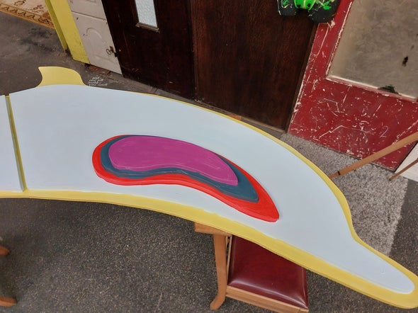 “Het was even zoeken en wennen aan de vraag om op de houten dolfijnen te werken. Ik wou mijn eigen stijl erop verwerken, maar een canvasdoek om binnen aan een muur te hangen of een houten paneel dat buiten in weer en wind zal staan is iets totaal anders.